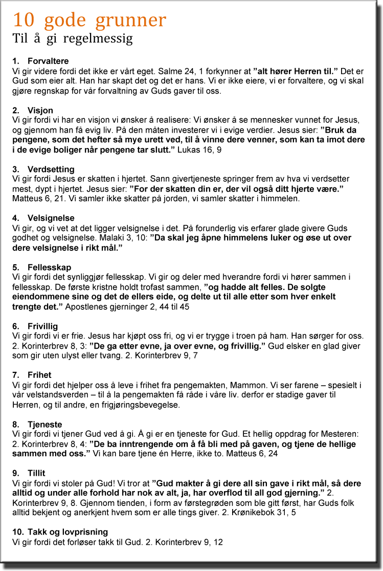 Vi ber ikke om en gave. Vi ber om at du skal ta økonomisk medansvar for din menighet. Norkirken Nordhordland får ingen offentlig støtte til drift. Vi er avhengige av at våre medlemmer dekker kostnadene. Vårt mål er å dekke mesteparten av våre driftsutgifter gjennom fast givertjeneste, og samtidig velsigne andre med minst 10 % av våre samlede inntekter fra givertjenesten og offergaver hver søndag. Det er mange bibelske grunner for å gi. Hvis du klikker på bildet til høyre så vil du finne noen punkter om dette.